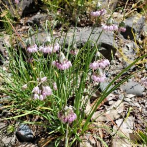 Clumping green grass like leaves with strong onion scent. Flowers are nodding, pink, bell shaped blooms. Pollinators, especially bees, love this flower